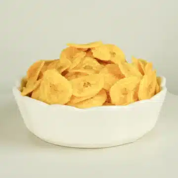 Kerala chips are thinly sliced raw bananas (typically the Nendran variety) deep-fried to golden perfection in coconut oil, giving them a distinct aroma and crunch. These chips are seasoned with a touch of salt, and sometimes turmeric, for a savory finish. In sweeter versions, jaggery syrup coats the chips for a caramelized glaze.